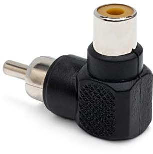 90 degree RCA adapter connects a subwoofer cable, RCA audio cable or RCA component video cable to an A V receiver, subwoofer, DVD player, soundbar, car stereo, desktop computer or TV