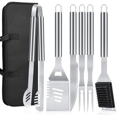 The Most Complete & Professional Grill Set Starting grilling with this 29pcs practical bbq set to meet all your needs, you will not bother anymore to choose grilling accessories. This grill utensils set consists of barbecue spatula, barbeque fork, 2 Different style tongs, basting brush, grill brush, replacement brush head, kitchen scissors, meat thermometer, salt & pepper shaker, 8 corn holders, 4 kabab skewers, 4 drinking straws, straws cleaning brush and portable zipper bag.