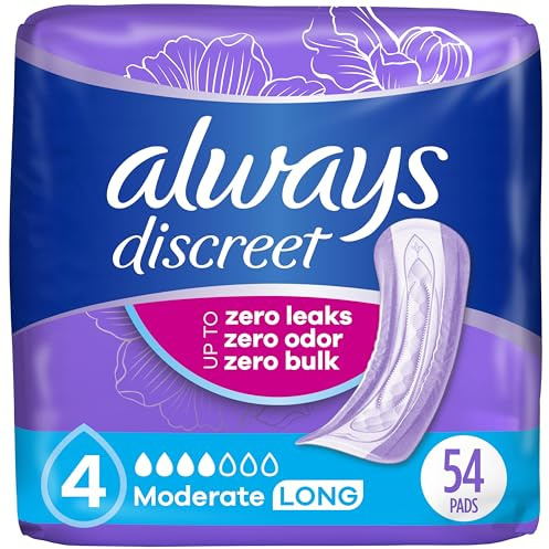 Always Discreet Adult Incontinence Pads for Women, Drier, 4 Drop Long Length, Moderate Absorbency, Pads for Bladder Control Management, Bladder Leaks, & Postpartum Pads, 54ct