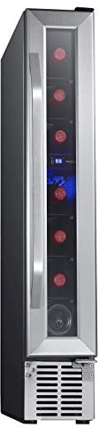 Affordable Luxury This elegant freestanding wine fridge holds up to 12 standard-sized wine bottles and features premium beechwood sliding shelves for easy access to your wine collection